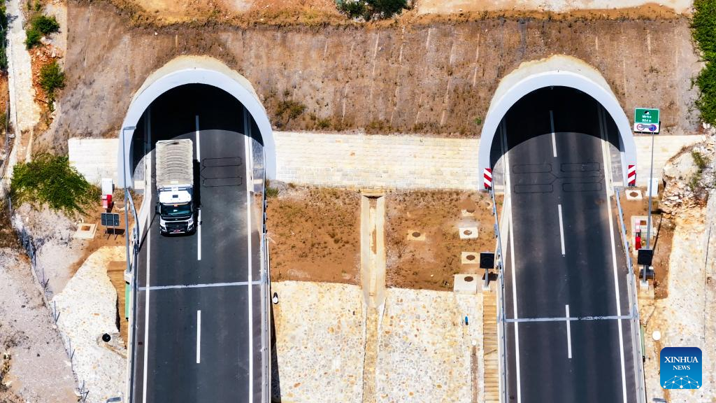 Foto aérea tirada no dia 24 de julho de 2023 mostra túneis no trecho prioritário da rodovia Bar-Boljare em Montenegro. (Foto por Wang Wei/Xinhua)