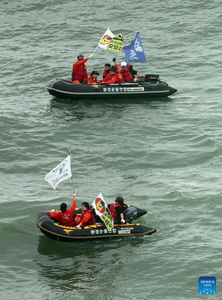 Pessoas protestam contra decisão do Japão de despejar águas residuais contaminadas com energia nuclear em Busan, Coreia do Sul, no dia 24 de agosto de 2023. O Japão começou a despejar águas residuais contaminadas com energia nuclear da fechada usina nuclear de Fukushima Daiichi no Oceano Pacífico na quinta-feira, apesar da forte oposição interna e externa. (NEWSIS via Xinhua)