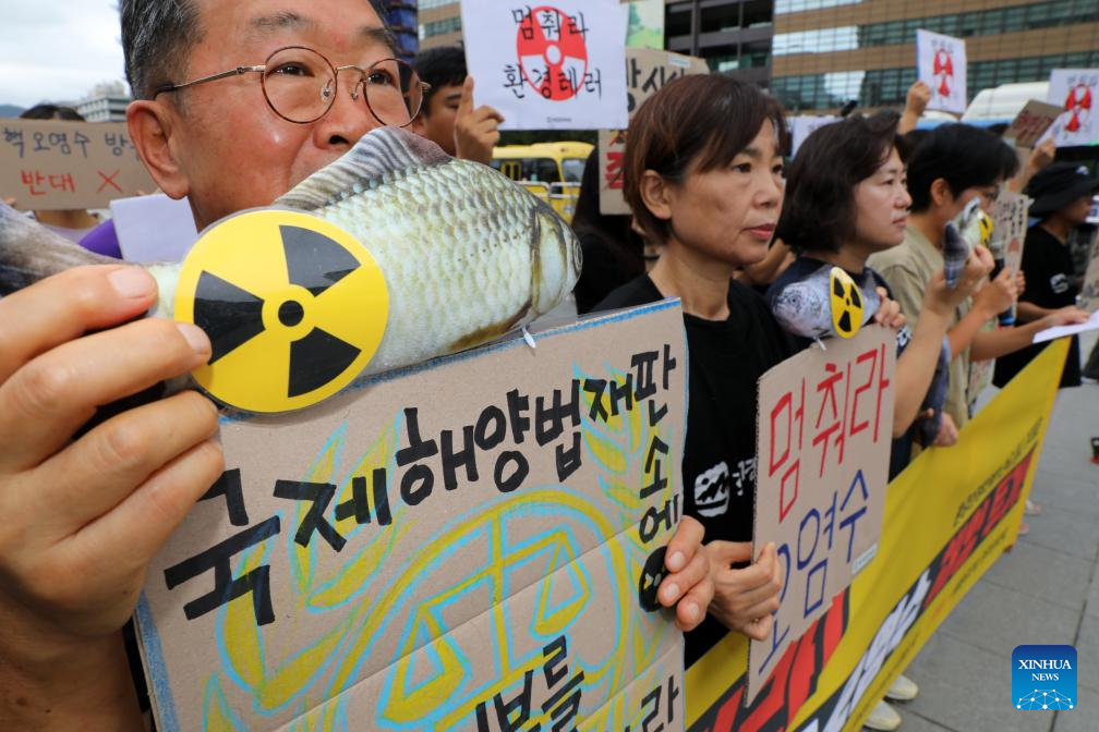 Pessoas protestam contra decisão do Japão de despejar águas residuais contaminadas com energia nuclear em Seul, Coreia do Sul, no dia 24 de agosto de 2023. O Japão começou a despejar águas residuais contaminadas com energia nuclear da fechada usina nuclear de Fukushima Daiichi no Oceano Pacífico na quinta-feira, apesar da forte oposição interna e externa. (NEWSIS via Xinhua)