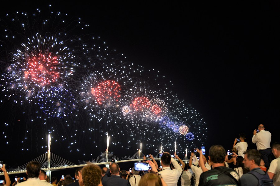 Pessoas assistem a um show de fogos de artifício durante a cerimônia de inauguração da Ponte de Peljesac em Komarna, Croácia, no dia 26 de julho de 2022. (Xinhua/Li Xuejun)