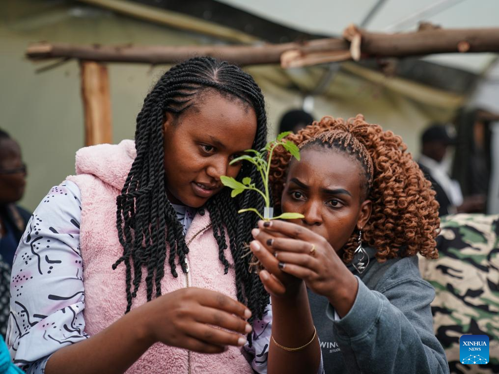 Estagiárias quenianas observam uma muda na Aldeia de Matangi Tisa, no Condado de Nakuru, Quênia, no dia 18 de setembro de 2023. (Xinhua/Han Xu)