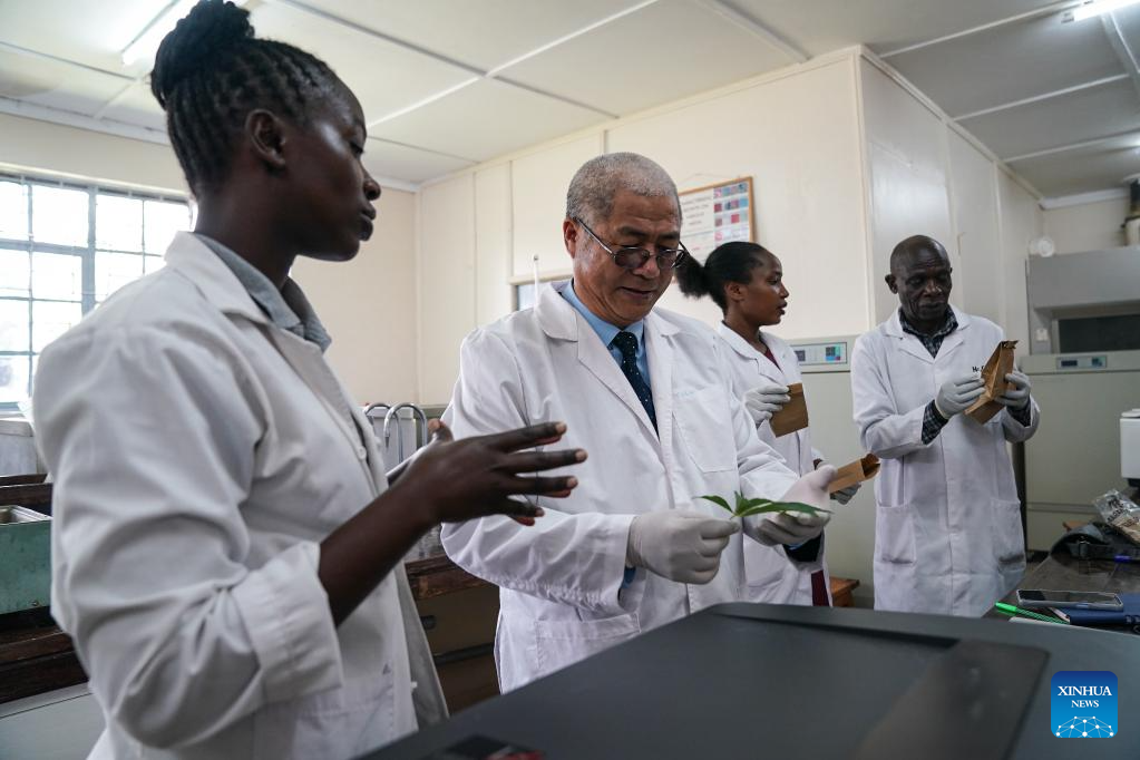 Um professor chinês instrui estudantes de pós-graduação quenianos no Laboratório Conjunto China-Quênia do Cinturão e Rota sobre Biologia Molecular de Plantas Agrícolas na Universidade Egerton no Condado de Nakuru, Quênia, no dia 18 de setembro de 2023. (Xinhua/Han Xu)