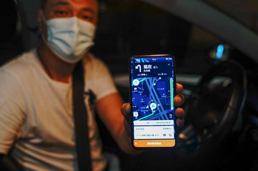 Huang Xing, motorista de carona, mostra seu primeiro pedido de cliente do dia, em Shanghai, leste da China, em 1º de junho de 2022. (Xinhua/Ding Ting)
