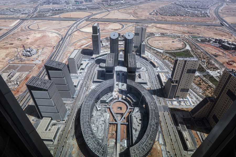 Foto tirada no dia 11 de setembro de 2023 mostra canteiro de obras do projeto Distrito Financeiro Central (DFC) construído pela China State Construction Engineering Corporation (CSCEC) na nova capital administrativa, a leste do Cairo, Egito. (Xinhua/Ahmed Gomaa)