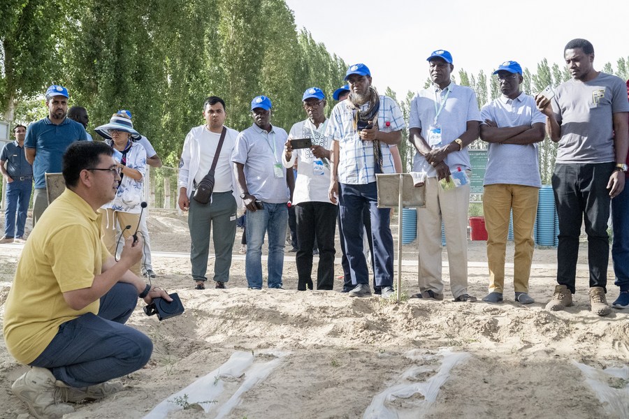 Especialista chinês mostra plantas do deserto para pessoas de países da Ásia Central em estação de pesquisa de deserto na Região Autônoma Uigur de Xinjiang, noroeste da China, no dia 13 de junho de 2023. (Xinhua/Zhou Shengbin)