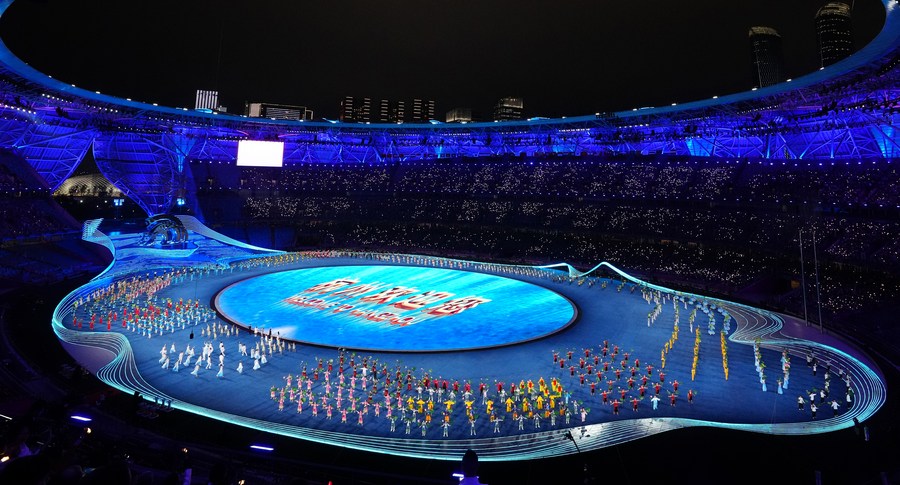 Artistas se apresentam antes da cerimônia de abertura dos 19º Jogos Asiáticos, no Estádio do Centro Esportivo Olímpico de Hangzhou, em Hangzhou, em 23 de setembro de 2023. (Xinhua/Jiang Wenyao)