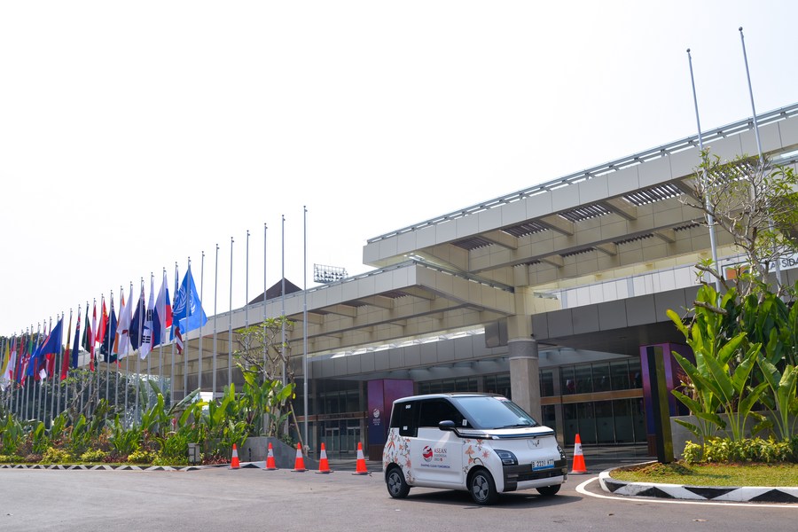 Veículo elétrico da Wuling Air parado em frente ao local da 43ª edição da Cúpula da Associação das Nações do Sudeste Asiático (ASEAN) em Jacarta, Indonésia, no dia 6 de setembro de 2023. (Xinhua/Xu Qin)