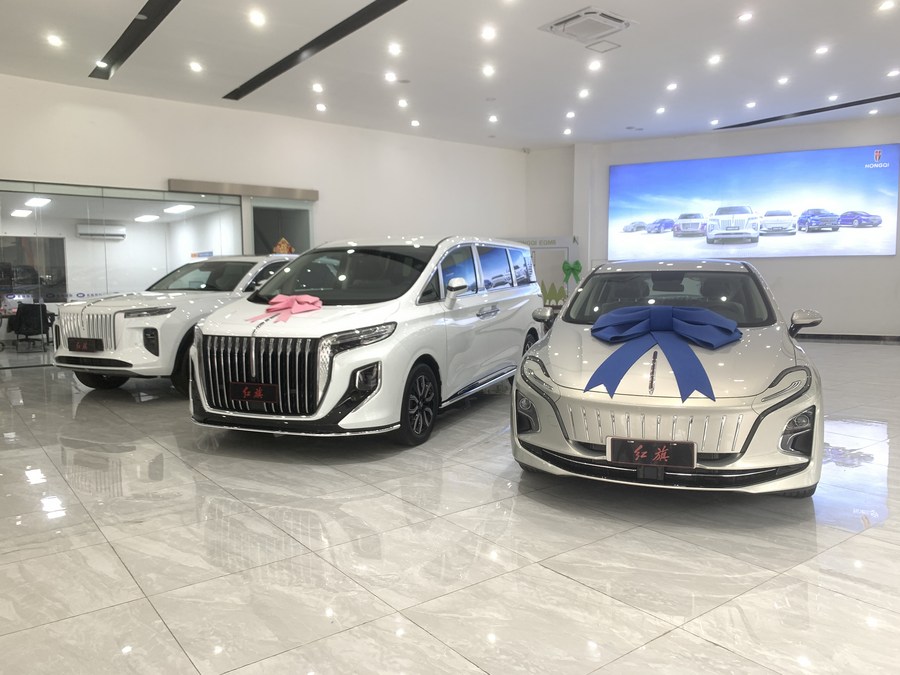 Veículos elétricos Hongqi de fabricação chinesa exibidos em showroom em Phnom Penh, Camboja, no dia 11 de setembro de 2023. (Foto por Van Pov/Xinhua)