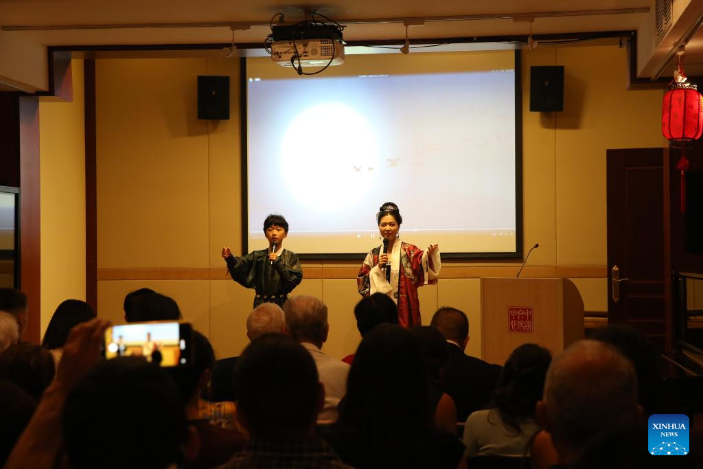 Pessoas recitam poema chinês durante comemoração do Festival Chinês do Meio Outono em Valeta, Malta, no dia 28 de setembro de 2023. O Centro Cultural da China em Malta sediou na noite de quinta-feira uma celebração vibrante do O Centro Cultural da China em Malta sediou na noite de quinta-feira uma comemoração animada do Festival Chinês do Meio Outono, apresentando muitas atividades, incluindo música, confecção e degustação de bolo da lua, confecção de lanternas e caligrafia. (Xinhua/Chen Wenxian)