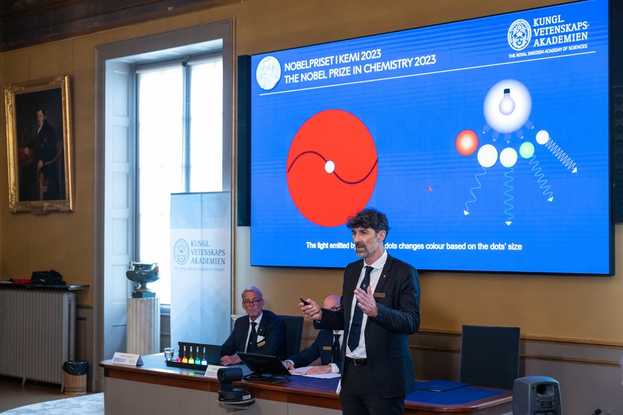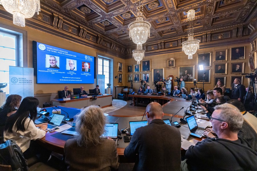 O anúncio do Prêmio Nobel de Química de 2023 é realizado na Academia Real das Ciências da Suécia em Estocolmo, Suécia, em 4 de outubro de 2023. (Foto por Wei Xuechao/Xinhua)