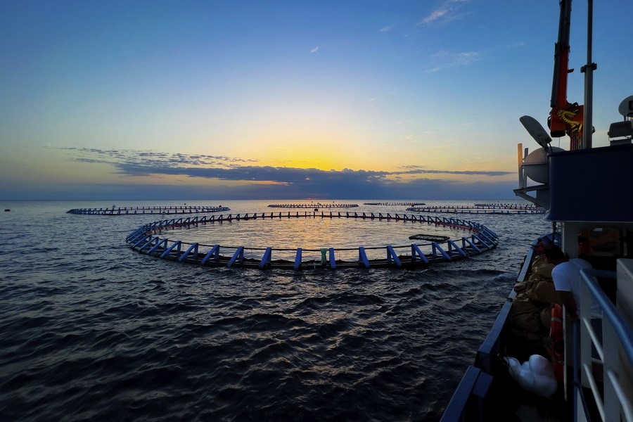 Foto tirada em 1º de setembro de 2022 mostra uma fazenda de atum azul em Xemxija, Malta. A criação de atum azul desempenha um papel importante no setor da aquicultura de Malta. (Foto por Jonathan Borg/Xinhua)