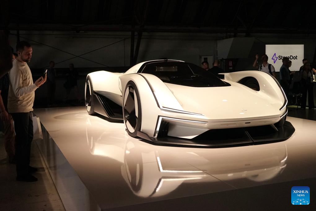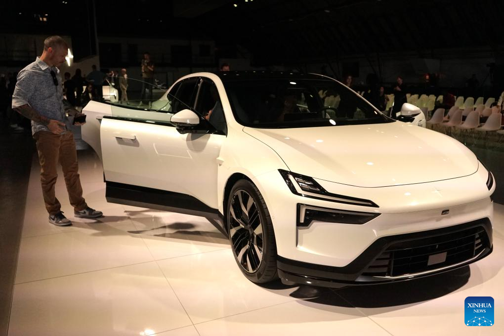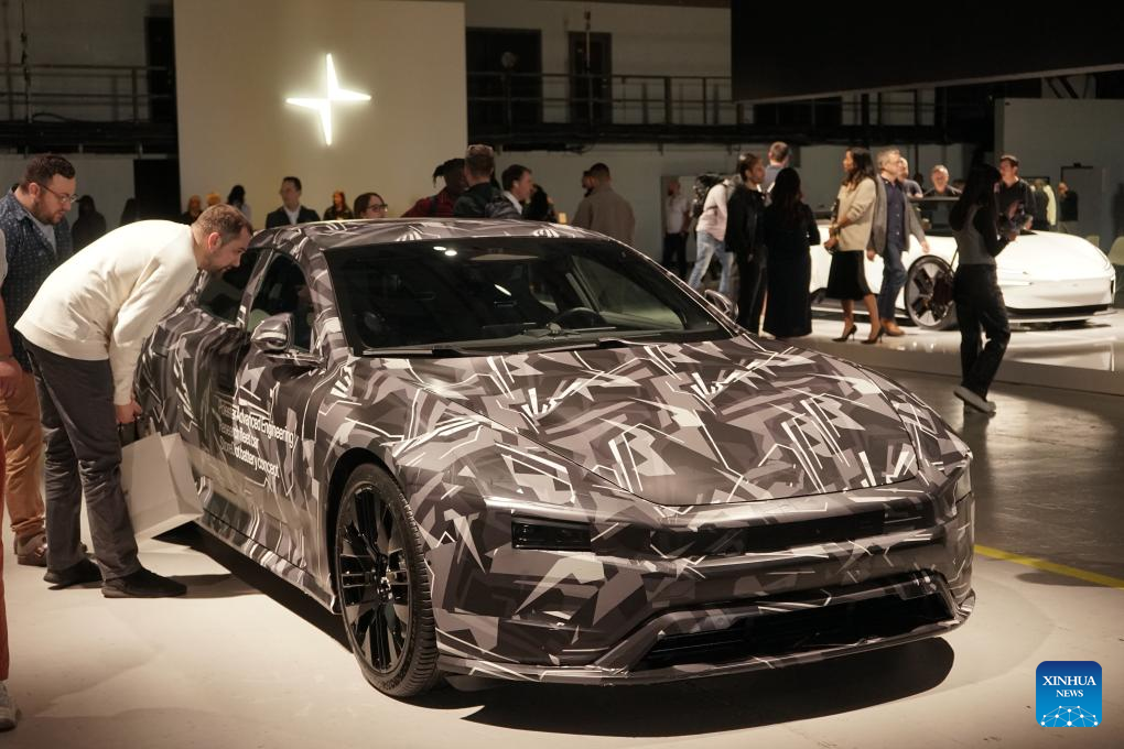 Visitantes olham carro elétrico em evento de demonstração de inovação da Polestar em Los Angeles, Estados Unidos, no dia 9 de novembro de 2023. A fabricante sueca de veículos elétricos (VEs) Polestar deseja aumentar a cooperação tecnológica com a China e buscar maiores oportunidades no mercado chinês, disse em entrevista à Xinhua na quinta-feira o CEO da Polestar, Thomas Ingenlath. (Foto por Zeng Hui/Xinhua)