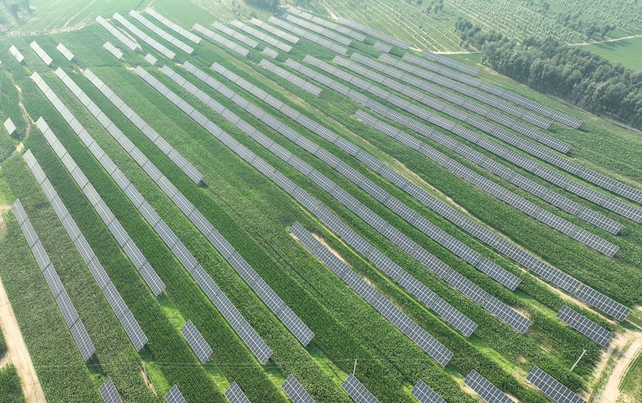 Foto aérea tirada em 11 de julho de 2023 mostra painéis fotovoltaicos no distrito de Zhangwu, na Província de Liaoning, no nordeste da China. (Xinhua/Long Lei)