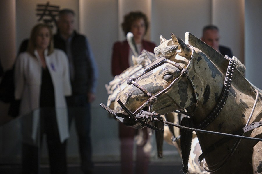 Pessoas em exposição sobre renomados guerreiros de terracota da China em Alicante, Espanha, no dia 28 de março de 2023. (Xinhua/Meng Dingbo)