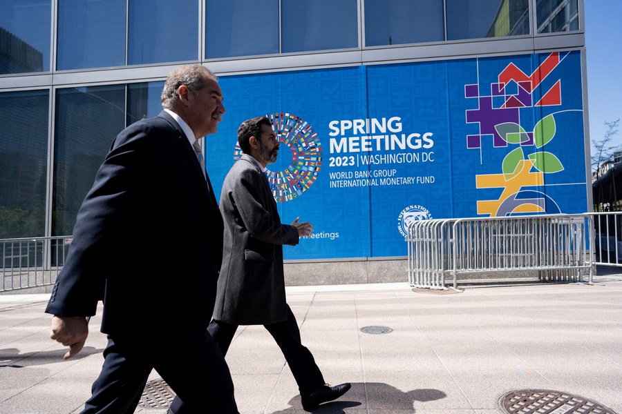 Pedestres passam pela sede do Fundo Monetário Internacional em Washington, D.C., Estados Unidos, em 10 de abril de 2023. (Xinhua/Liu Jie)