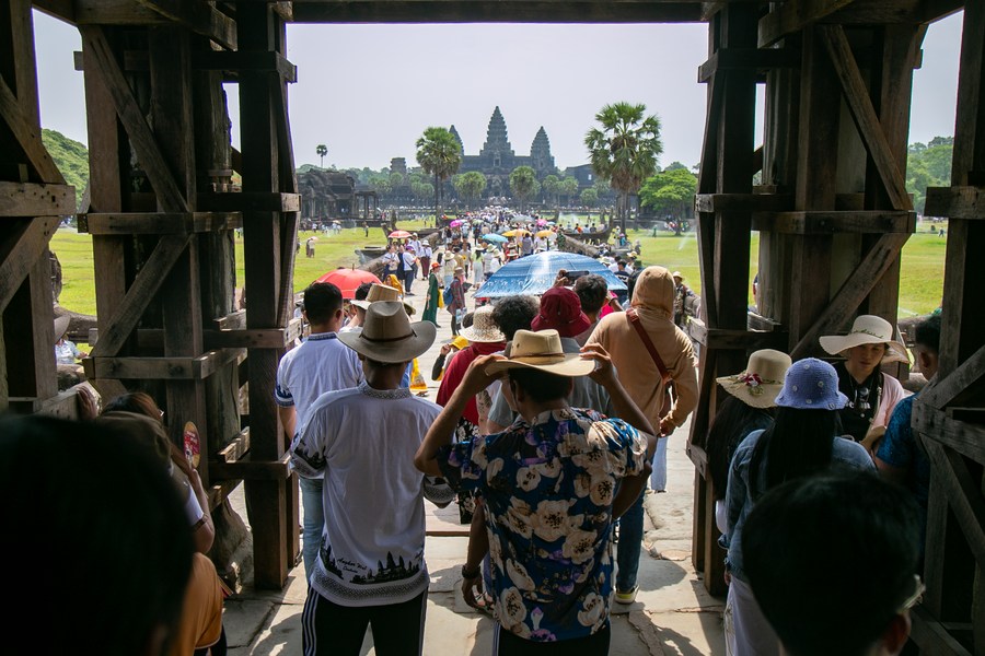 Turistas visitam o Parque Arqueológico de Angkor na Província de Siem Reap, Camboja, em 16 de abril de 2023.(Foto de Sao Khuth/Xinhua)