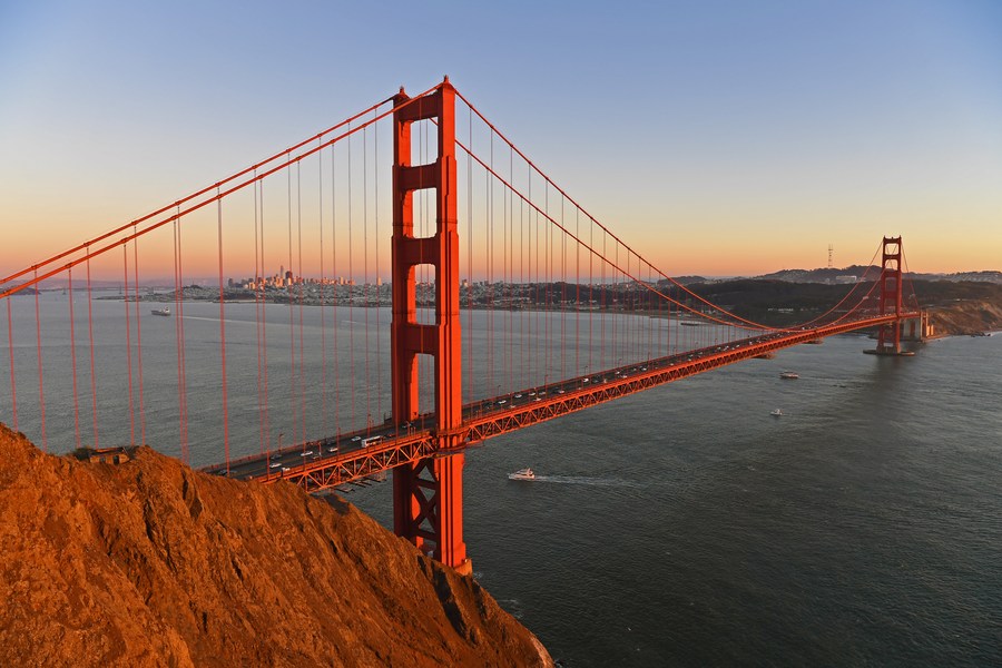 Foto tirada no dia 11 de novembro de 2023 mostra a Ponte Golden Gate ao pôr do sol em São Francisco, Estados Unidos. (Xinhua/Li Rui)