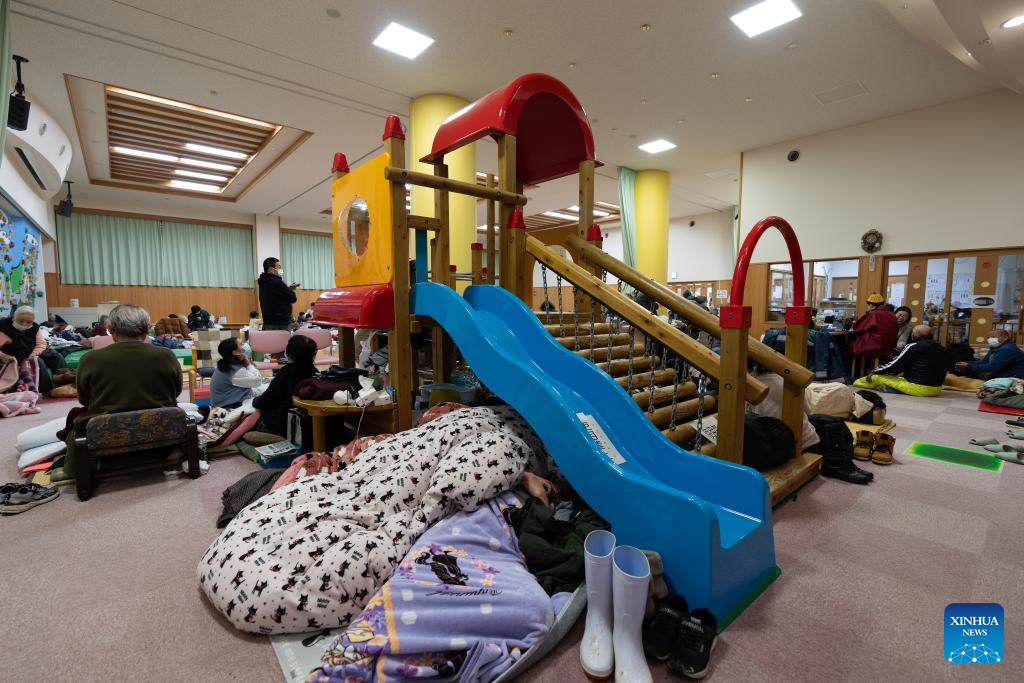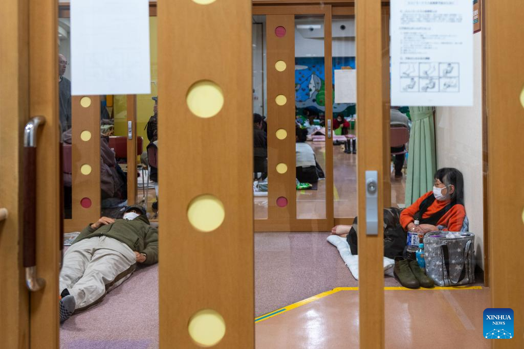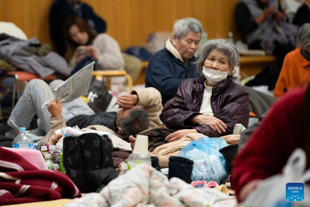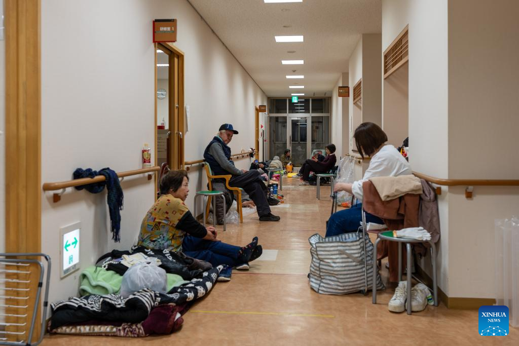 Pessoas descansam em abrigo temporário em Wajima, província de Ishikawa, Japão, no dia 3 de janeiro de 2024. Vários terremotos fortes, com um deles de magnitude 7,6, ocorreu na segunda-feira em profundidade rasa na região de Noto, na província de Ishikawa. Até o momento, 22 abrigos temporários foram fornecidos às pessoas afetadas pelo terremoto na cidade mais atingida, Wajima, em Ishikawa. (Xinhu a/Zhang Xiaoyu)