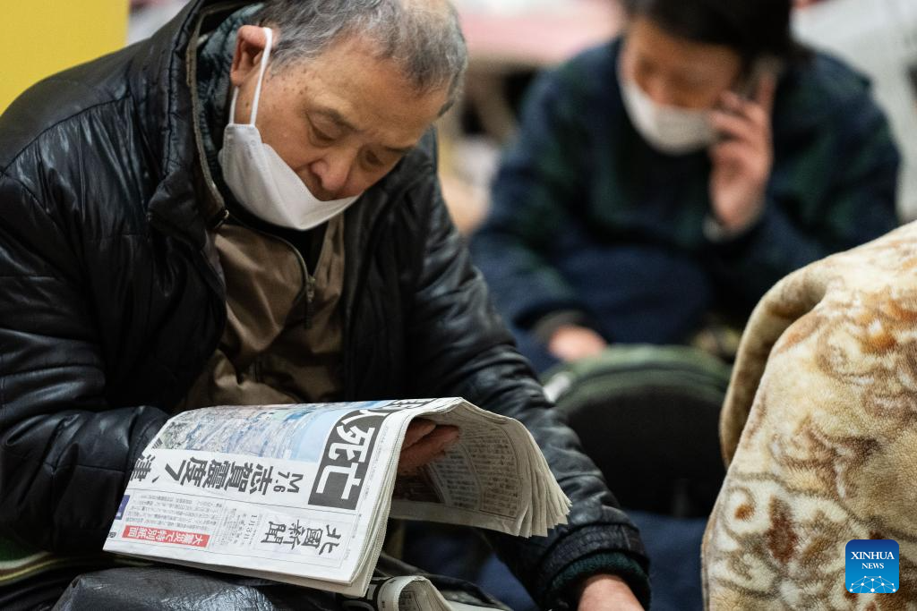 Homem lê notícias sobre o terremoto em abrigo temporário em Wajima, província de Ishikawa, Japão, no dia 3 de janeiro de 2024. Vários terremotos fortes, com um deles de magnitude 7,6, ocorreu na segunda-feira em profundidade rasa na região de Noto, na província de Ishikawa. Até o momento, 22 abrigos temporários foram fornecidos às pessoas afetadas pelo terremoto na cidade mais atingida, Wajima, em Ishikawa. (Xinhua/Zhang Xiaoyu)