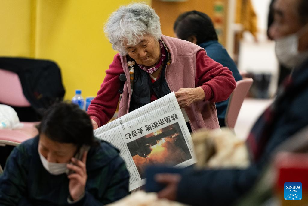 Mulher lê notícias sobre terremoto em abrigo temporário em Wajima, província de Ishikawa, Japão, no dia 3 de janeiro de 2024. Vários terremotos fortes, com um deles de magnitude 7,6, ocorreu na segunda-feira em profundidade rasa na região de Noto, na província de Ishikawa. Até o momento, 22 abrigos temporários foram fornecidos às pessoas afetadas pelo terremoto na cidade mais atingida, Wajima, em Ishikawa. (Xinhua/Zhang Xiaoyu)