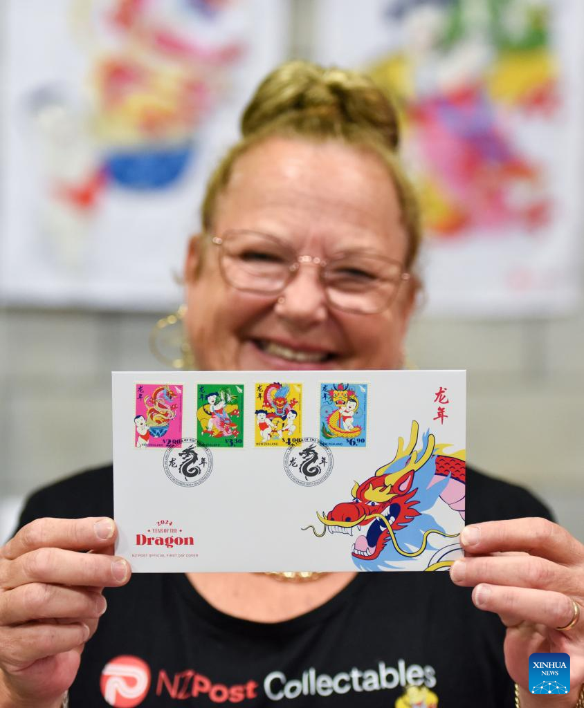 Um membro da equipe do New Zeland Post mostra os selos do Ano do Dragão no evento Festival do Ano Novo Chinês e Dia do Mercado em Auckland, Nova Zelândia, em 3 de fevereiro de 2024. O Auckland Showgrounds, um centro de eventos e exposições, se encheu de cores e festividade neste sábado (3) com a abertura do evento Festival do Ano Novo Chinês e Dia do Mercado, um evento característico que se tornou uma tradição de longa data adorada por várias comunidades da Nova Zelândia. (Xinhua/Guo Lei)