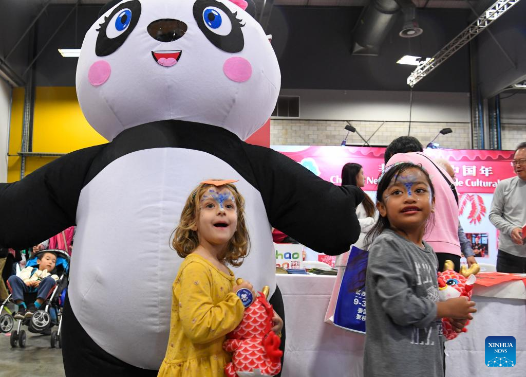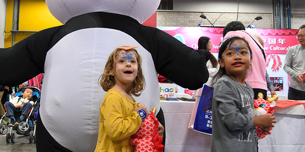 Crianças passam por um artista vestido de panda no evento Festival do Ano Novo Chinês e Dia do Mercado em Auckland, Nova Zelândia, em 3 de fevereiro de 2024. O Auckland Showgrounds, um centro de eventos e exposições, se encheu de cores e festividade neste sábado (3) com a abertura do evento Festival do Ano Novo Chinês e Dia do Mercado, um evento característico que se tornou uma tradição de longa data adorada por várias comunidades da Nova Zelândia. (Xinhua/Guo Lei)