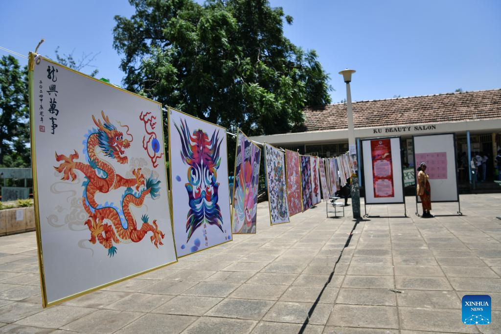 Foto mostra obras de arte exibidas na Exposição de Design do Dragão realizada na Universidade Kenyatta em Nairóbi, Quênia, 15 de fevereiro de 2024. O evento de um dia inteiro mostrando diferentes aspectos do dragão chinês foi realizado nesta quinta-feira na Universidade Kenyatta, a segunda universidade pública mais antiga do Quênia.. (Xinhua/Han Xu)