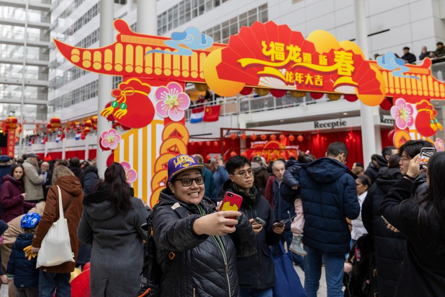 Pessoa tira uma selfie durante uma feira do templo para celebrar o Festival das Lanternas no Atrium City Hall em Haia, Holanda, em 24 de fevereiro de 2024. (Xinhua/Meng Dingbo)