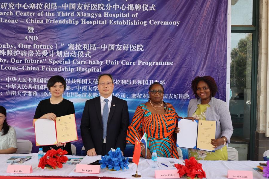 Representantes participam de uma cerimônia de assinatura no Hospital da Amizade Serra Leoa-China em Jui, uma cidade no subúrbio de Freetown, Serra Leoa, em 22 de fevereiro de 2024. (Xinhua/Shi Yu)