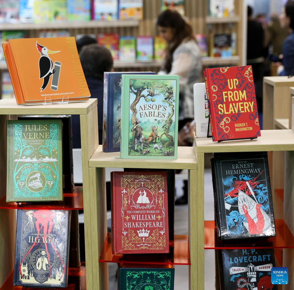 Foto tirada em 12 de março de 2024 mostra livros exibidos na Feira do Livro de Londres, em Londres, Reino Unido. A Feira do Livro de Londres, uma das maiores feiras editoriais do mundo, teve início na terça-feira. (Xinhua/Li Ying)