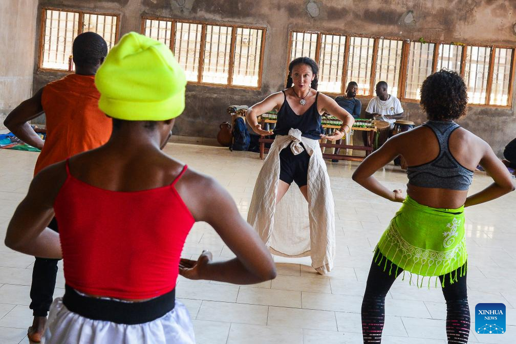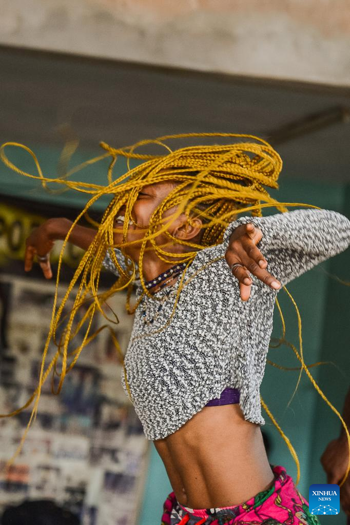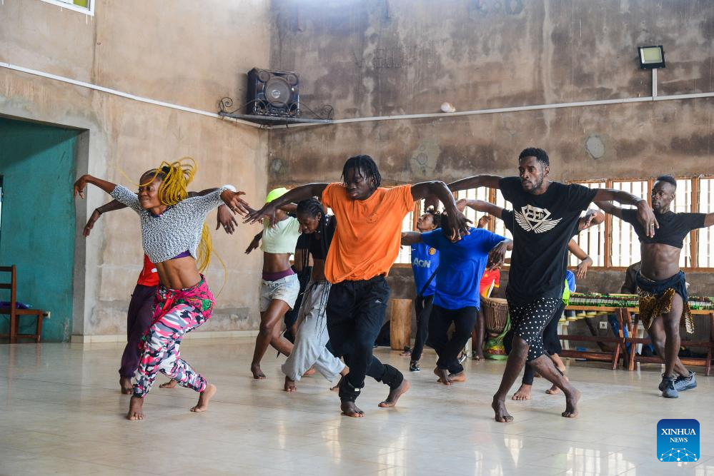 Foto tirada no dia 13 de fevereiro de 2024 mostra jovens dançarinos praticando dança em Iaundê, Camarões. (Foto por Kepseu/Xinhua)