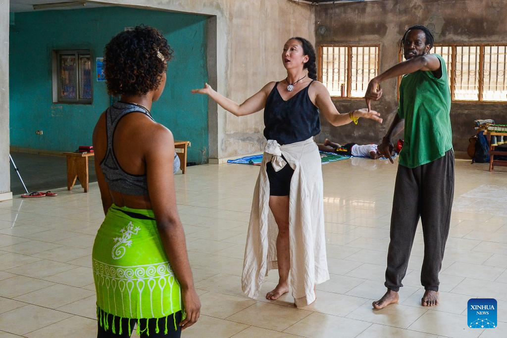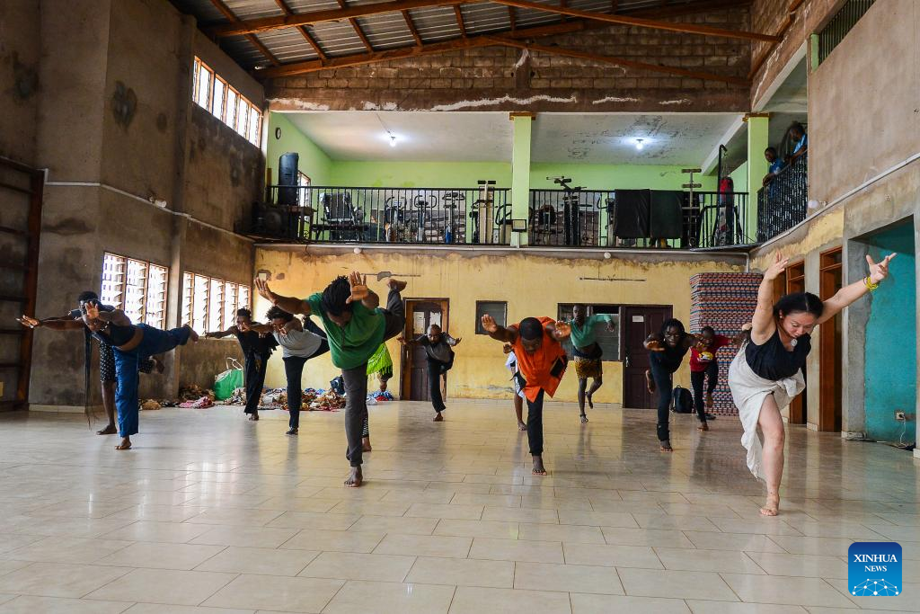 Jiang Keyu (centro) e Simon Abbe ensinam dança contemporânea a jovens em Iaundê, Camarões, no dia 14 de fevereiro de 2024. (Foto por Kepseu/Xinhua)