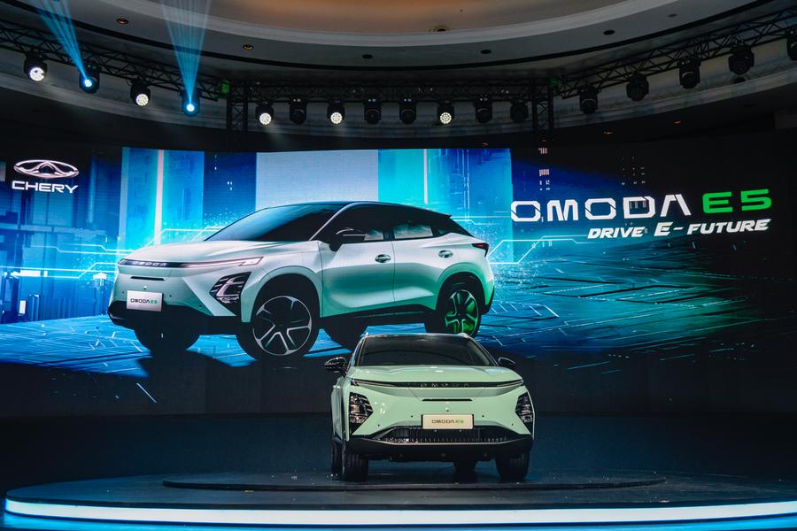 Foto tirada em 5 de fevereiro de 2024 mostra um Chery OMODA E5 na cerimônia de lançamento em Jacarta, Indonésia.(Xinhua/Xu Qin)