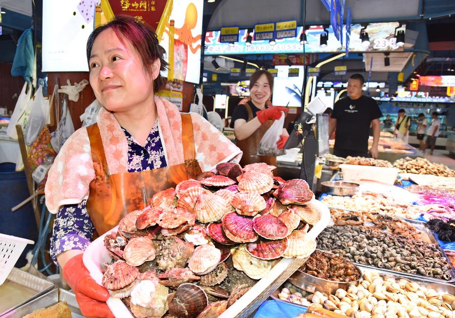 Vendedora prepara frutos do mar no Mercado Fushansuo, no distrito de Shinan, em Qingdao, província de Shandong, leste da China, no dia 7 de agosto de 2023. (Xinhua/Li Ziheng)