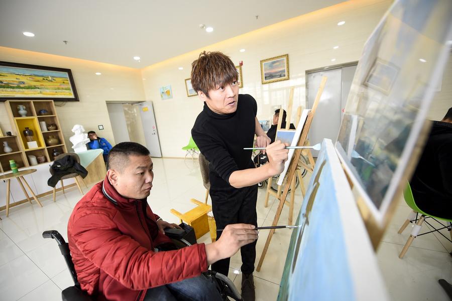 Foto de arquivo tirada em 3 de dezembro de 2018 mostra Zuo Wenjun (frente, d) ensinando um homem com deficiência a pintar a óleo no centro de serviços de reabilitação de Ningxia para deficientes em Yinchuan, Região Autônoma Hui de Ningxia, no noroeste da China. (Xinhua/Feng Kaihua)