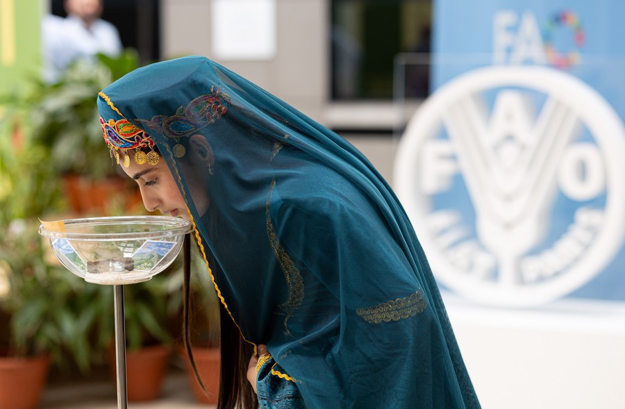 Uma visitante azerbaijana cheira chá chinês durante um evento de comemoração do Dia Internacional do Chá na sede da Organização das Nações Unidas para Alimentação e Agricultura em Roma, Itália, em 21 de maio de 2024. (Xinhua/Li Jing)