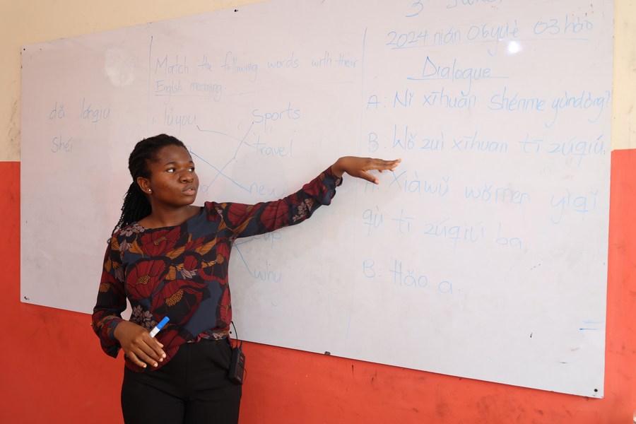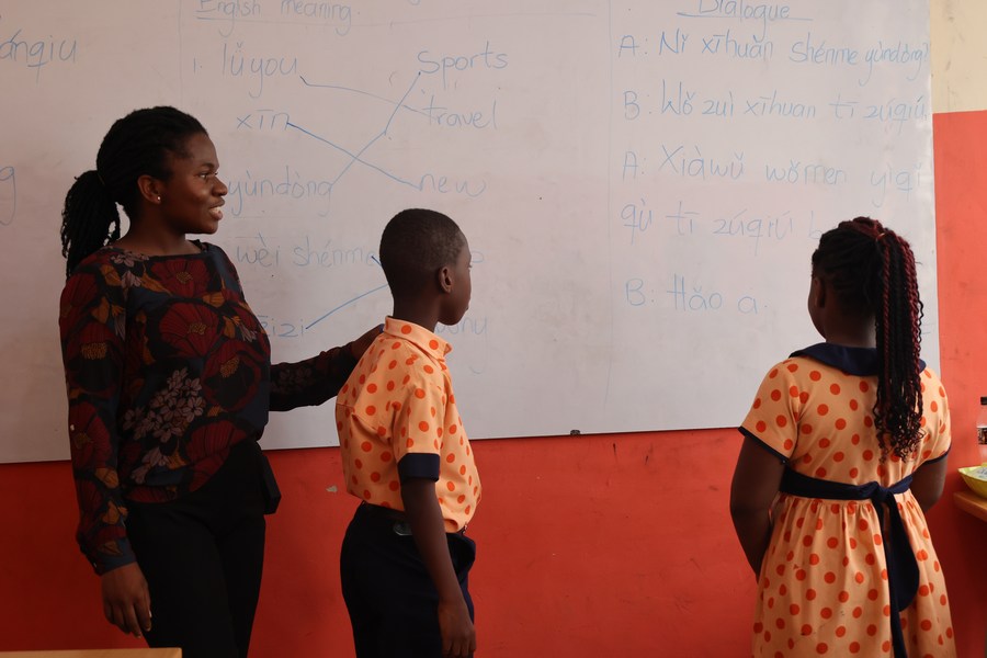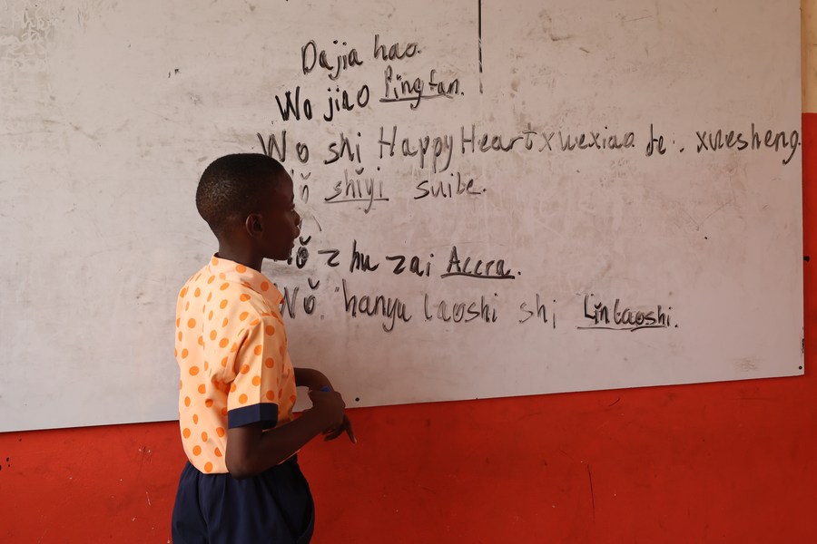 Em uma sala de aula, no entanto, Alvin Quartey, um dos alunos, estava liderando a classe para ler palavras em chinês escritas no quadro. Sob a supervisão da administradora da escola, Doreenda Nikoi Kotei, os alunos se revezavam para se apresentar no idioma chinês e traduzir algumas palavras chinesas para o inglês.