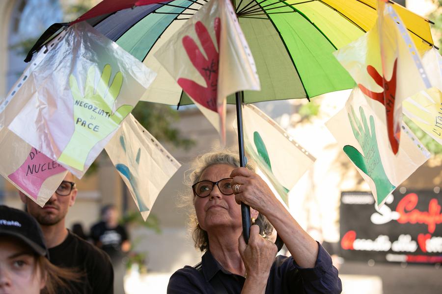 Mulher protesta durante uma manifestação anti-G7 em Fasano, Apúlia, no sul da Itália, em 14 de junho de 2024. (Xinhua/Li Jing)