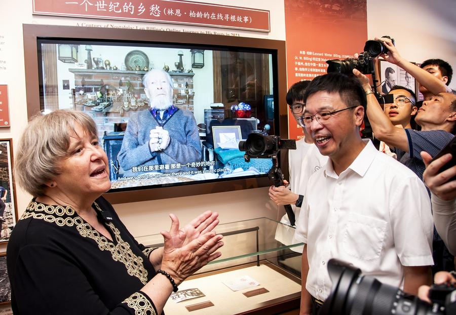 Elyn MacInnis (1ª e), consultora da associação de pesquisa de turismo e cultura de Kuliang, conta a história de Leonard Billing no Museu de Histórias das Famílias de Kuliang em Kuliang, Fuzhou, Província de Fujian, sudeste da China, em 22 de junho de 2024. (Xinhua/Wei Peiquan)