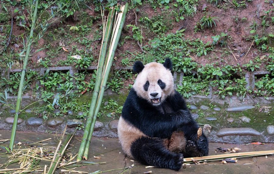 Foto tirada no dia 18 de abril de 2024 mostra panda gigante Xin Bao na Base de Pandas Bifengxia do Centro Chinês de Conservação e Pesquisa de Pandas Gigantes em Ya'an, província de Sichuan, sudoeste da China. (Xinhua/XueChen)