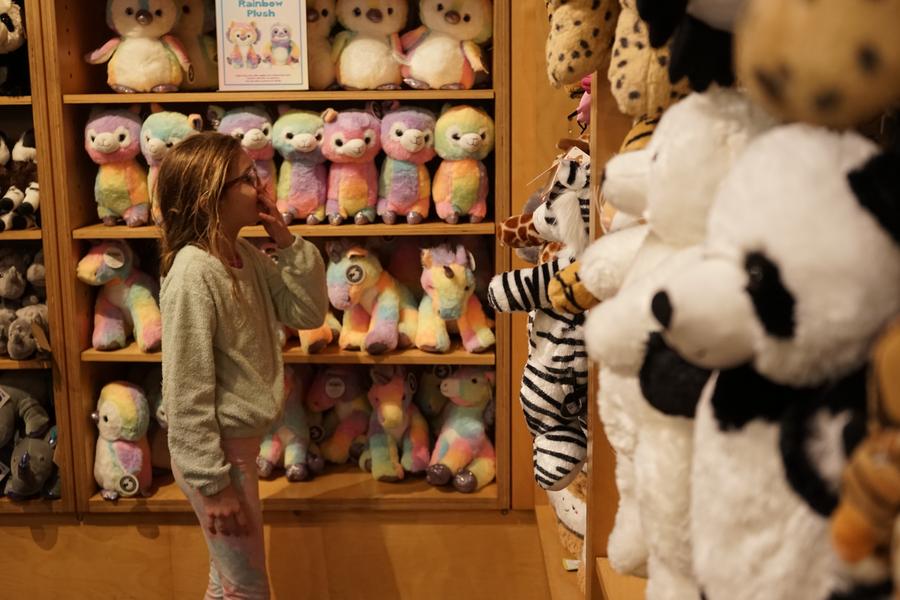 Menina em loja de presentes com pelúcias de panda gigante no Zoológico de San Diego, em San Diego, Califórnia, Estados Unidos, no dia 22 de fevereiro de 2024. (Foto por Zeng Hui/Xinhua)