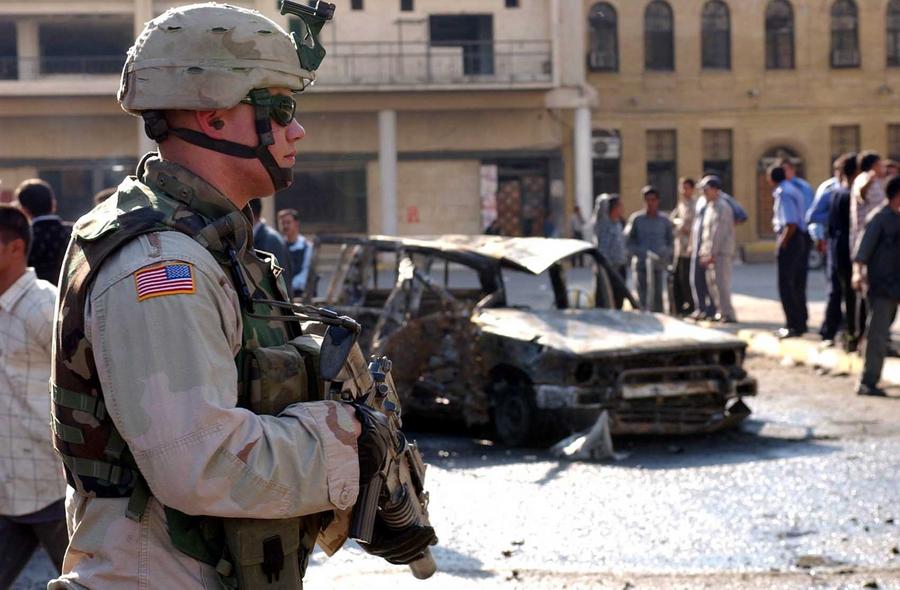 Soldado dos EUA fica de guarda perto de um veículo danificado em Bagdá, capital do Iraque, em 20 de novembro de 2004. (Foto da Xinhua/Ali Al-Shouk)