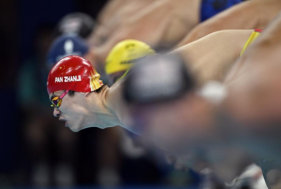 Pan Zhanle da China se prepara antes da final dos 100 metros livre da categoria masculina de natação nos Jogos Olímpicos de Paris 2024 em Paris, França, no dia 31 de julho de 2024. (Xinhua/Wang Peng)