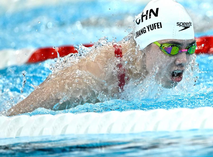 Zhang Yufei, da China, compete durante as semifinais femininas de 200 metros borboleta da natação nos Jogos Olímpicos de Paris 2024, em Paris, França, no dia 31 de julho de 2024. (Xinhua/Wang Peng)