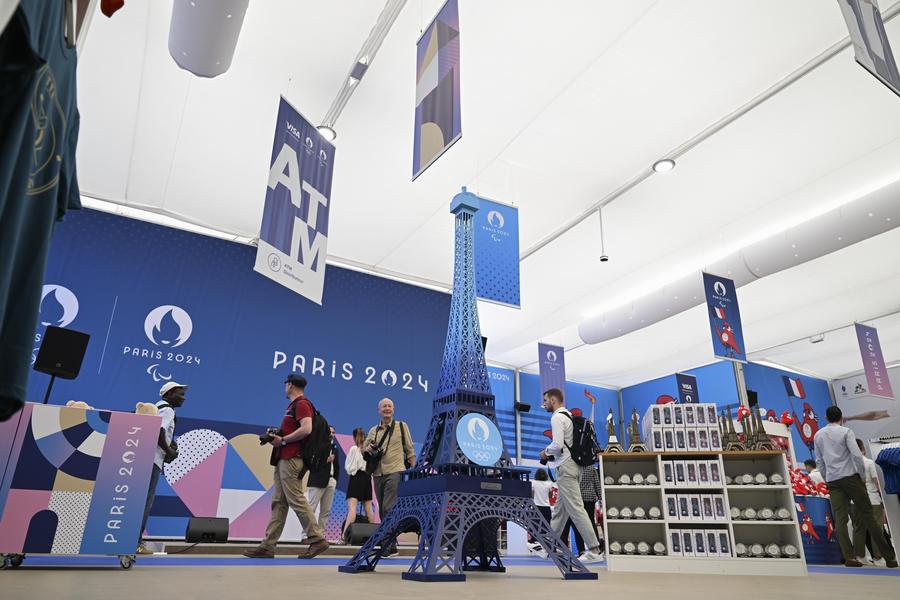 Uma maquete da Torre Eiffel é vista na loja oficial de Paris 2024 na Avenida Champs-Elysees em Paris, França, em 27 de junho de 2024. (Xinhua/He Changshan)
