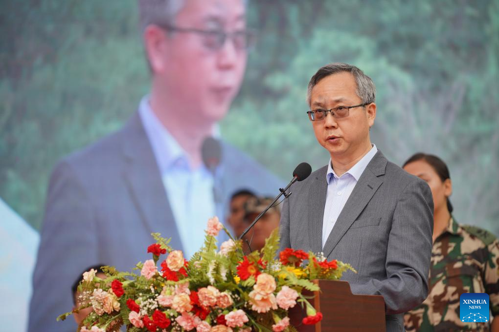 O embaixador chinês no Nepal, Chen Song, discursa na cerimônia pelo término da escavação do túnel no canteiro de obras do grande projeto do pacote 2 de construção rápida do Nepal, no distrito de Makwanpur, no Nepal, em 5 de agosto de 2024. A escavação do último túnel foi concluída na segunda-feira para o projeto do pacote 2, construído por uma empresa chinesa no âmbito do projeto Katmandu-Terai/Madhesh de construção rápida, que o primeiro-ministro nepalês, Sharma Oli, descreveu como um "marco importante" para alcançar as metas de desenvolvimento do Nepal. (Foto por Hari Maharjan/Xinhua)
