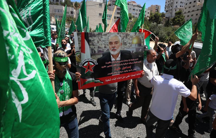 Pessoas participam de um protesto contra o assassinato do chefe do Politburo do Hamas, Ismail Haniyeh, na cidade de Hebron, na Cisjordânia, em 31 de julho de 2024. (Foto por Mamoun Wazwaz/Xinhua)