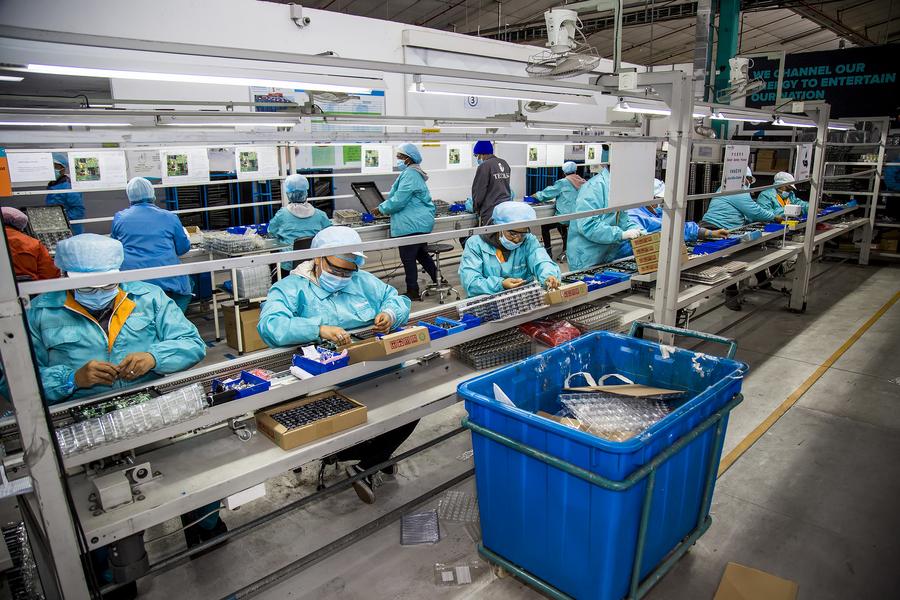 Trabalhadores na Hisense África do Sul no distrito de Atlantis, Cabo Ocidental, África do Sul, no dia 11 de agosto de 2020. (Xinhua/Fred Barker)