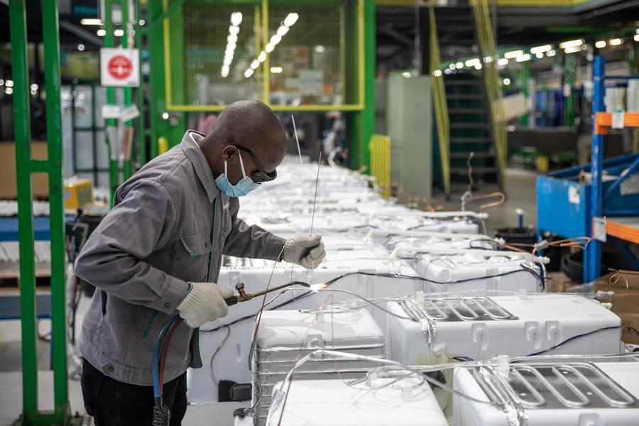 Trabalhador em linha de produção de refrigeradores no Parque Industrial Hisense África do Sul na Cidade do Cabo, África do Sul, 1º de junho de 2022. (Xinhua/Lyv Tianran)