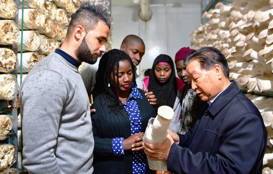 Lin Zhanxi (1º, à direita) da Universidade de Agricultura e Silvicultura de Fujian mostra tecnologia Juncao a estudantes africanos em Fuzhou, província de Fujian, sudeste da China, no dia 2 de novembro de 2018. (Xinhua/Wei Peiquan)